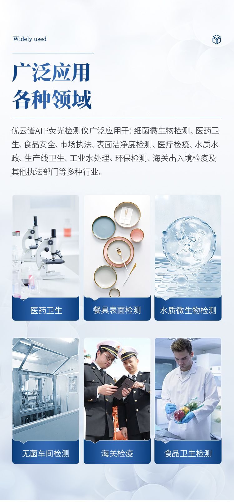 優云譜ATP熒光檢測儀用途廣泛,可用于: 食品、醫藥衛生、醫藥、日化、造紙、工業水處理、國防以及環保、水政、海關出入境檢疫及其他執法部門等多種行業 。