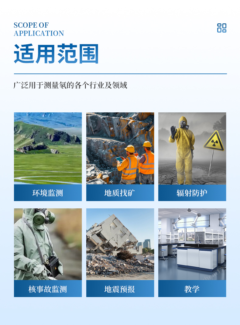 環(huán)境空氣、土壤、水等氡體積活度及土壤、建材等表面氡析出率的測(cè)量。可用于環(huán)境監(jiān)測(cè)、地質(zhì)找礦、輻射防護(hù)、核事故監(jiān)測(cè)、輻射劑量評(píng)價(jià)、地震預(yù)報(bào)及教學(xué)等。