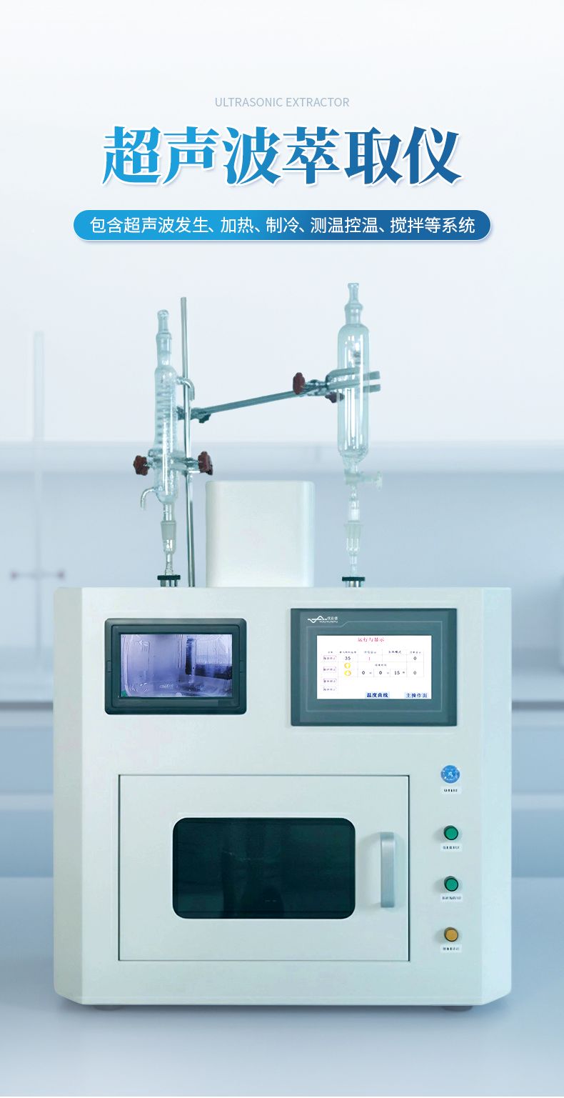 超聲波萃取儀使用超聲波技術然后結合運用低溫恒溫系統作為輔助,整套系統包含大功率超聲波 發生系統、加熱系統、壓縮機制冷系統、測溫控溫系統、攪拌系統等,在能控制反應體系溫度的 條件下,能有效促進反應物的高效率混合及促進催化化學反應。