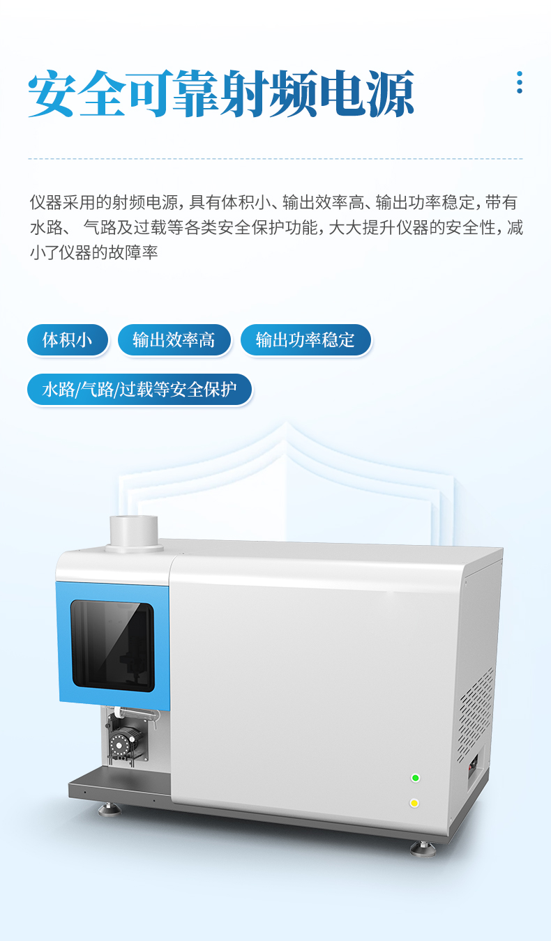 1、安全可靠的固態射頻電源:儀器采用的射頻電源,具有體積小、輸出效率高、輸出功率穩定,帶有水路、 氣路及過載等各類安全保護功能,大大提升儀器的安全性,減小了儀器的故障率。