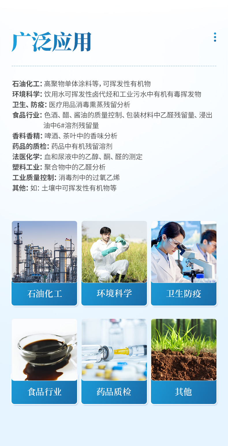 ⑷ 食品行業:色酒、醋、醬油的質量控制、包裝材料中乙醛殘留量、浸出油中6#溶劑殘留量;