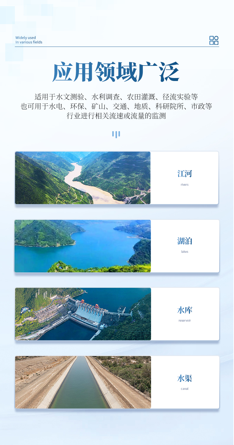 該流速儀廣泛適用于水文測(cè)驗(yàn)、水利調(diào)查、農(nóng)田灌溉、徑流實(shí)驗(yàn)等,亦可適用于水電、環(huán)保、礦山、交通、地質(zhì)、科研院所、市政等行業(yè)進(jìn)行相關(guān)流速或流量的監(jiān)測(cè)。
