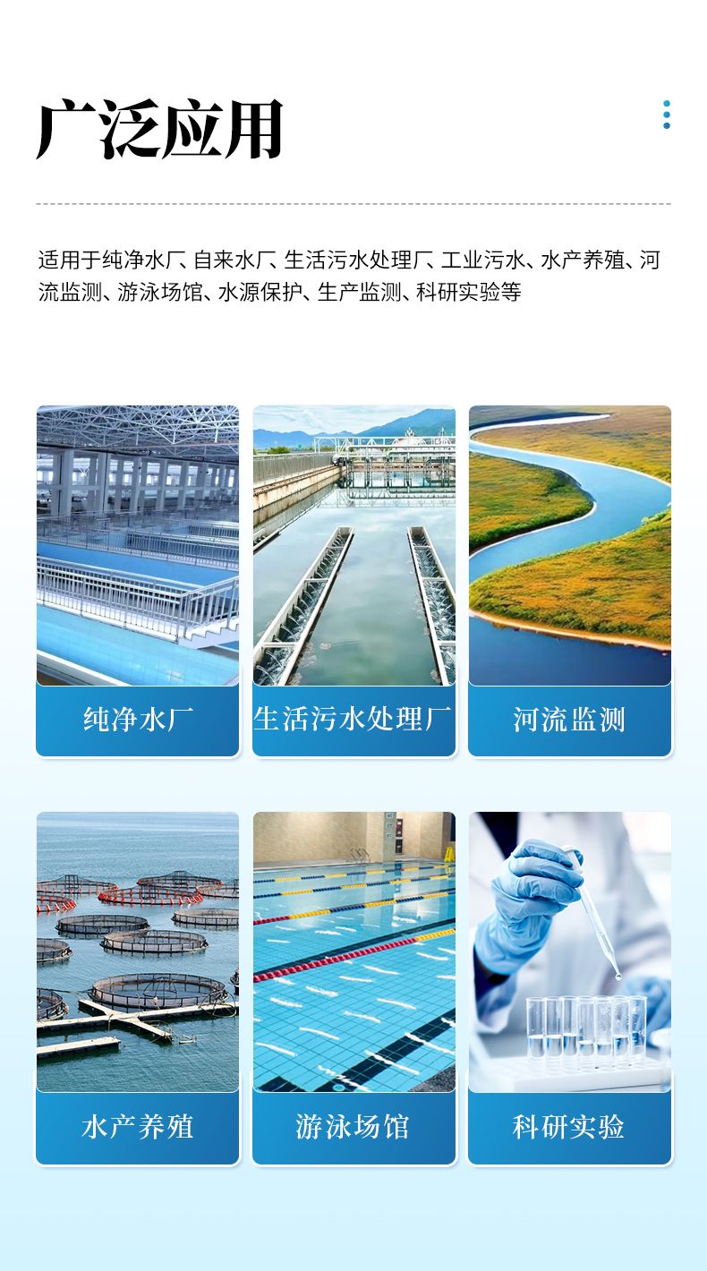 適用于純凈水廠、自來(lái)水廠、生活污水處理廠、工業(yè)污水、水產(chǎn)養(yǎng)殖、河流監(jiān)測(cè)、游泳場(chǎng)館、水源保護(hù)、生產(chǎn)監(jiān)測(cè)、科研實(shí)驗(yàn)等。