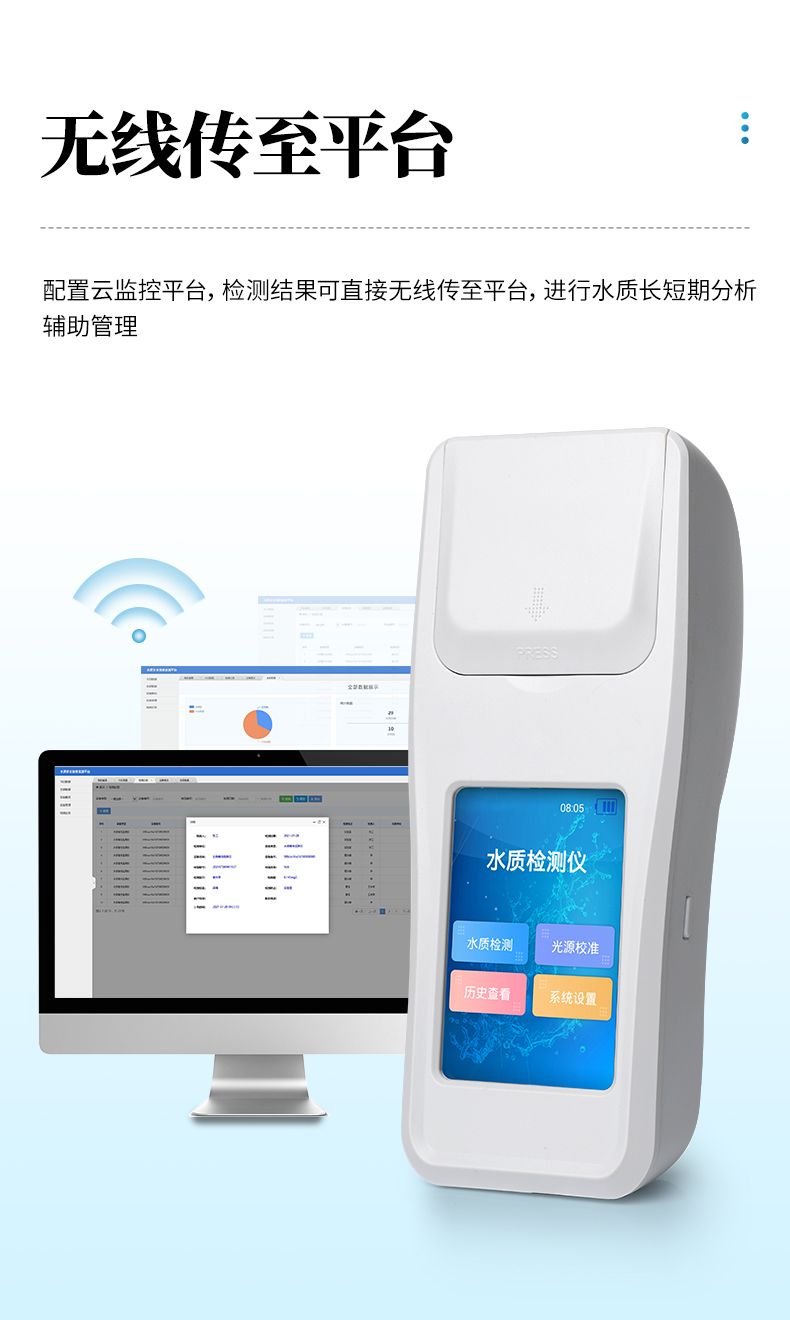 ②配置云監(jiān)控平臺(tái),檢測(cè)結(jié)果可直接無(wú)線(xiàn)傳至平臺(tái),進(jìn)行水質(zhì)長(zhǎng)短期分析,輔助管理。