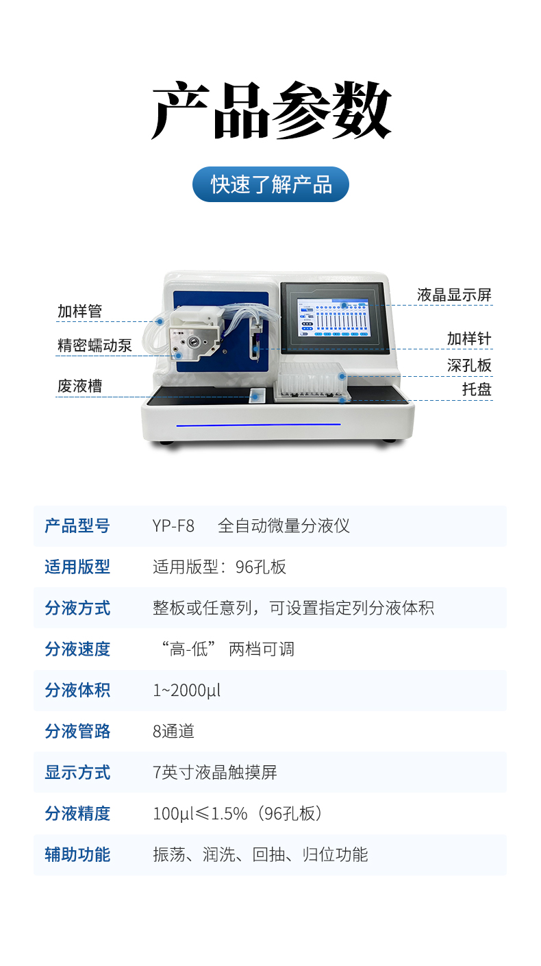 全自動微量分液儀(以下簡稱“分液儀”)是一種配備高精度蠕動泵的分液設備,能夠快速、精確、一致的完成自動化分液操作。可廣泛應用于疾控篩查、食品檢測、動物檢疫、生命科學研究等領域。解放實驗員雙手,在提高效率的同時避免錯誤。