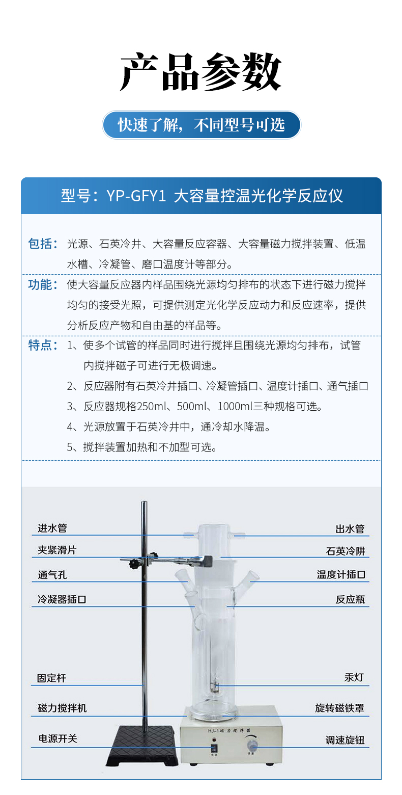 | YP-GFY2 多試管反應(yīng)器 | 包括:光源、石英冷井、石英試管、濾光裝置、多試管攪拌裝置、低溫水槽等部分。 功能:使試管內(nèi)樣品圍繞光源均勻排布的狀態(tài)下進(jìn)行磁力攪拌均勻的接受光照,可提供測(cè)定光化學(xué)反應(yīng)動(dòng)力常數(shù)、量子產(chǎn)率等 特點(diǎn):1、使多個(gè)試管的樣品同時(shí)進(jìn)行攪拌且圍繞光源均勻排布,試管內(nèi)攪拌磁子可進(jìn)行無極調(diào)速,可連接氣相色譜儀。 2、光源放置于石英冷井中,通冷卻水降溫。 3、石英試管內(nèi)放置光照溶液,30ml或50ml可選 |