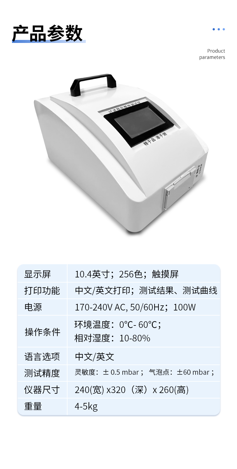 測試耗時 | 基本泡點測試:2 min±2min;擴散流測試7±2min; 水浸入流量測試7±2min;系統氣密性:3±1min; |