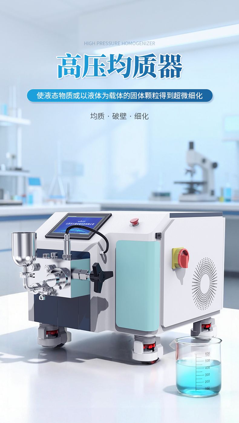高壓均質機是以高壓往復泵為動力傳遞及物料輸送機構,將物料輸送至工作閥部分。物料在通過工作閥的過程中,在高壓下產生強烈的剪切、撞擊和空穴作用,從而使液態物質或以液體為載體的固體顆粒得到超微細化。