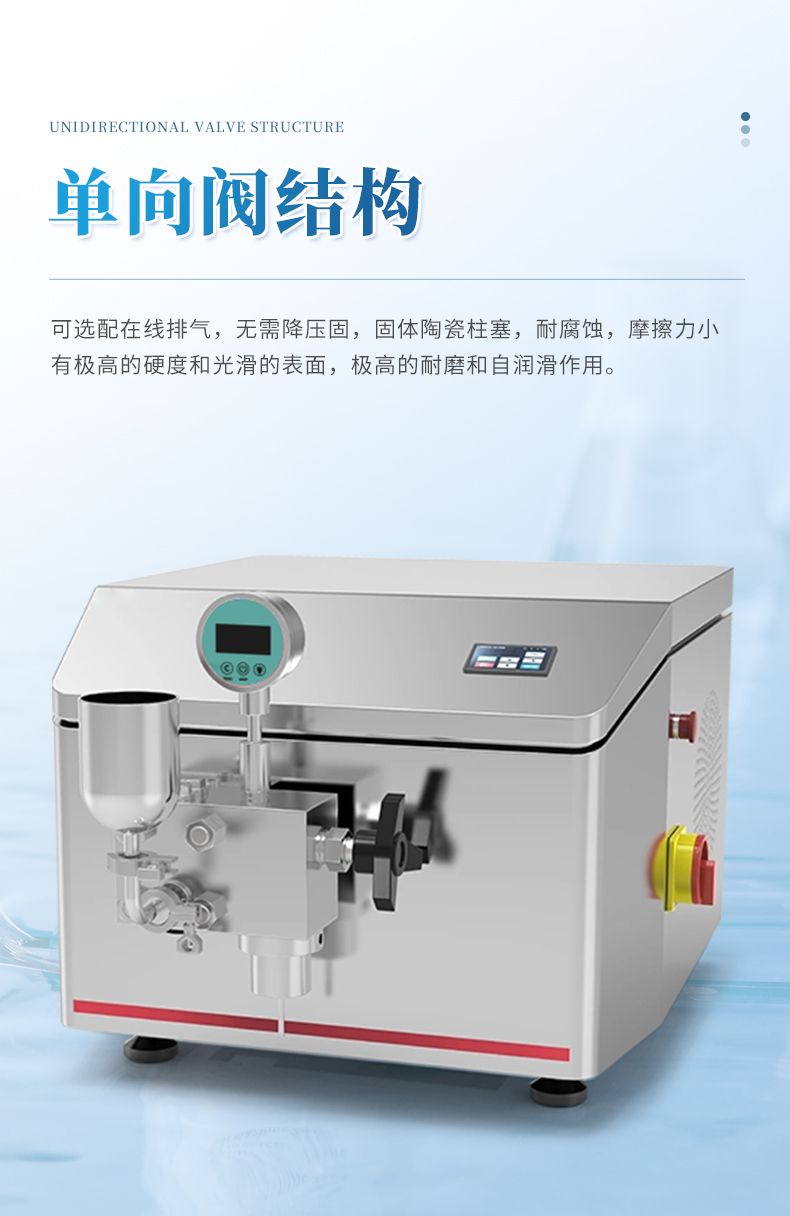 高壓均質(zhì)機是以高壓往復泵為動力傳遞及物料輸送機構(gòu),將物料輸送至工作閥部分。物料在通過工作閥的過程中,在高壓下產(chǎn)生強烈的剪切、撞擊和空穴作用,從而使液態(tài)物質(zhì)或以液體為載體的固體顆粒得到超微細化。
