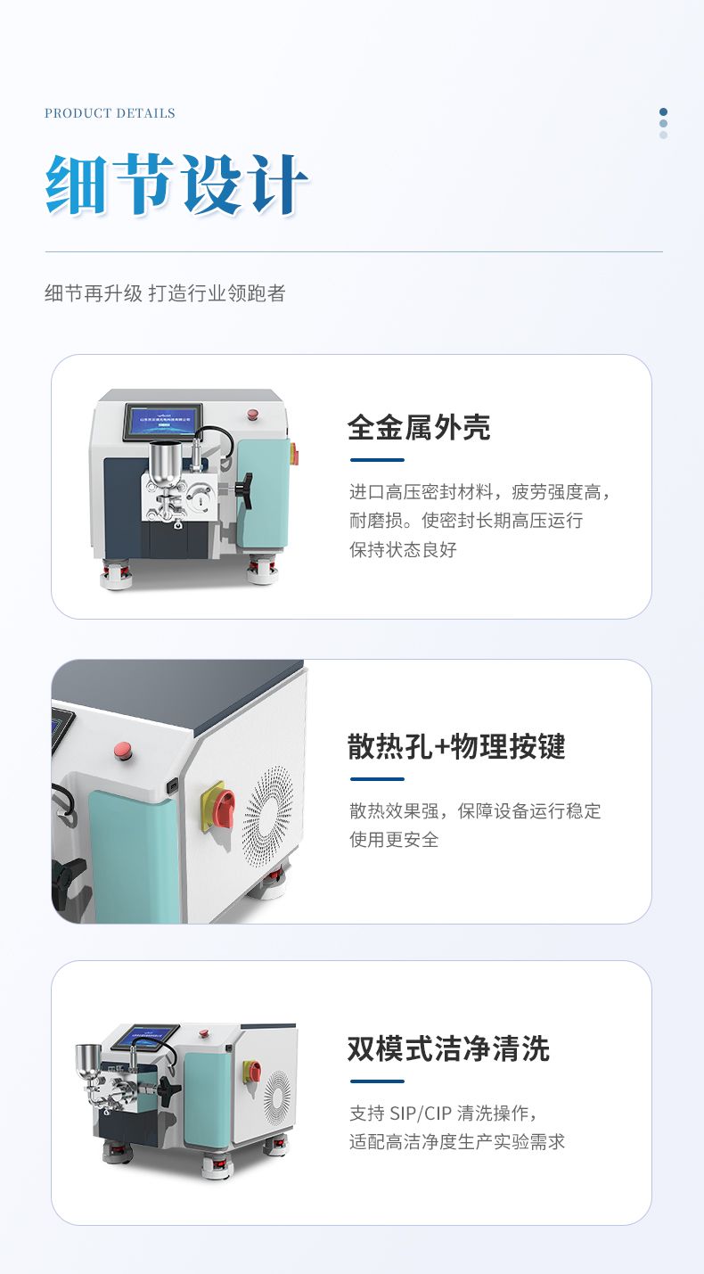6、物料控溫:要求均質(zhì)閥帶控溫夾套與控溫介質(zhì)出入接頭、連接管路,可實現(xiàn)在線控溫,出料溫度控制在 -5℃~100 ℃ (根據(jù)物料要求不同而定);實現(xiàn)高壓均質(zhì)部件恒溫控制,實現(xiàn)設備與物料同時控溫。保證物料生物學活性。