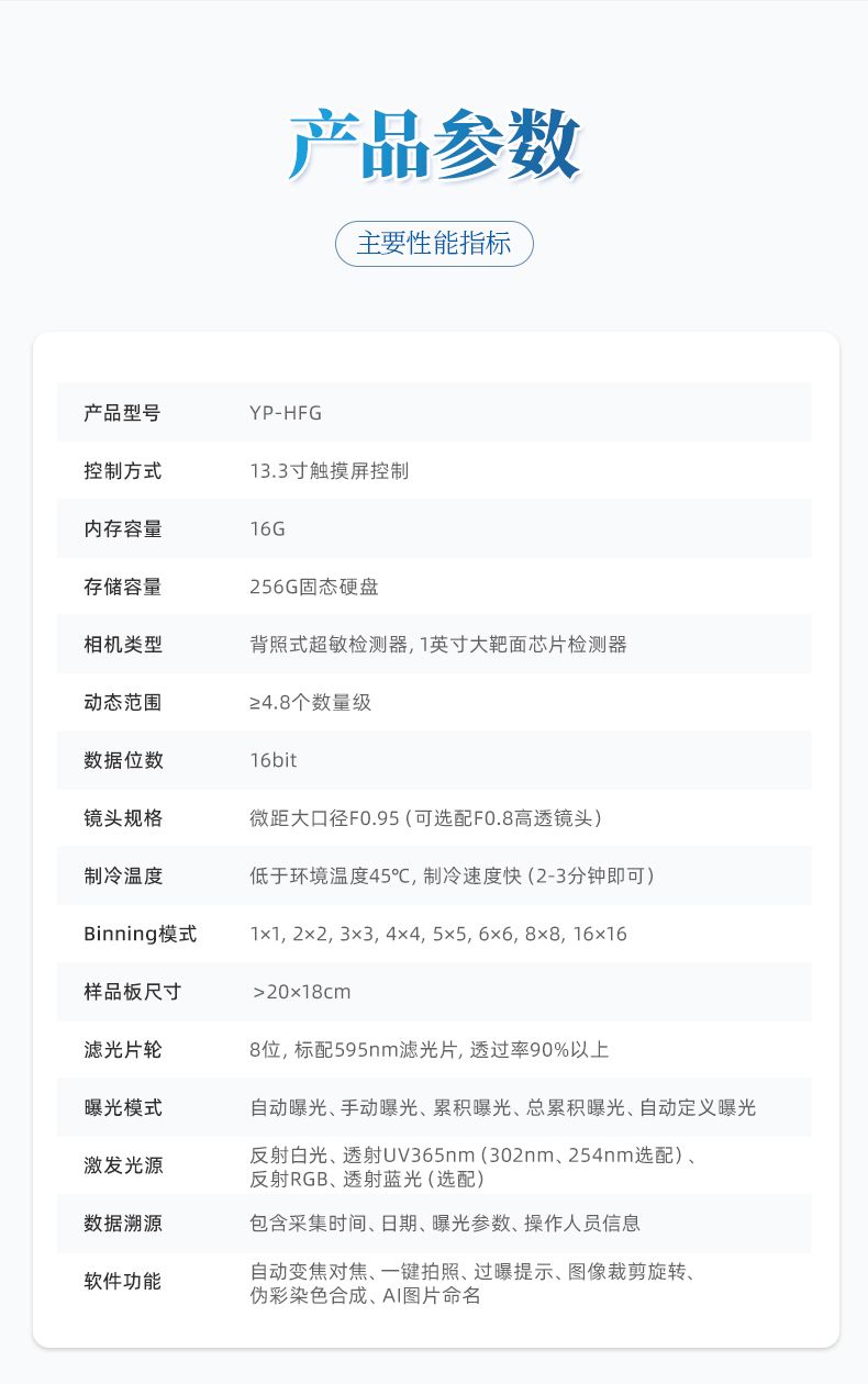 采用 13.3 寸觸摸屏控制,內存 16G,256G 固態硬盤,使儀器具有更強大圖像計算及 處理能力,配合圖像采集軟件操作簡捷直觀,軟件具有自動采集信號及彩色 marker,并進 行自己處理合成功能;曝光模式分為自動曝光、手動曝光、累積曝光、總累積曝光以及自 動定義曝光功能。配合圖像分析軟件可對圖像信號進行定性定量分析。