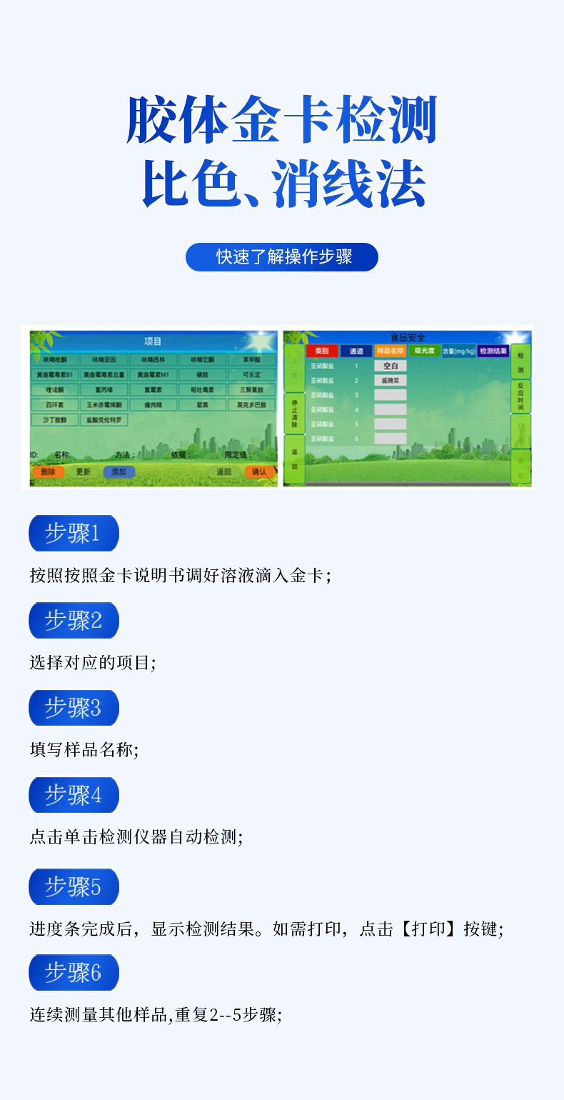 該儀器廣泛應用于食藥監局、衛生監督部門、高教院校、科研院所、農業部門、商業系統養殖場、屠宰場、食品肉產品深加工企業、畜牧獸醫、檢驗檢疫部門、食品生產企業、農副產品批發市場、農業生產基地、超市、餐廳、食堂、等單位部門對食品中的不安全指標進行監測使用。