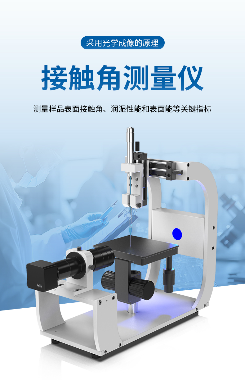 光學(xué)接觸角測量儀是測量液體對固體材料接觸角的儀器,主要用于表征液體對固體材料表面的潤濕性能,通過光學(xué)成像獲取液滴的圖像,利用計算機(jī)軟件,通過數(shù)學(xué)模型擬合出液滴圖像的輪廓并得到接觸角或表面張力,并進(jìn)行表面能計算和潤濕性分析。