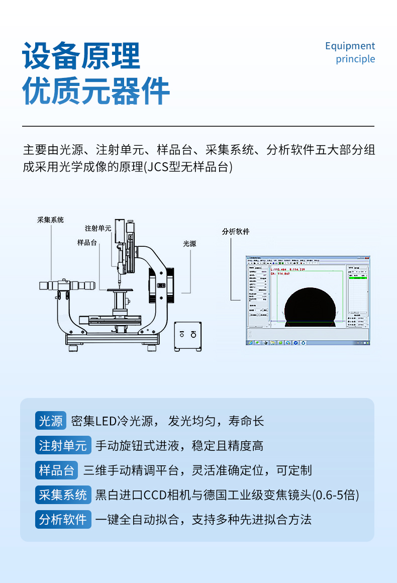 如上圖、接觸角測量儀主要由光源、注射單元、樣品臺、采集系統、整體傾斜平臺、分 析軟件六大部分組成 ,設備采用光學成像的原理。