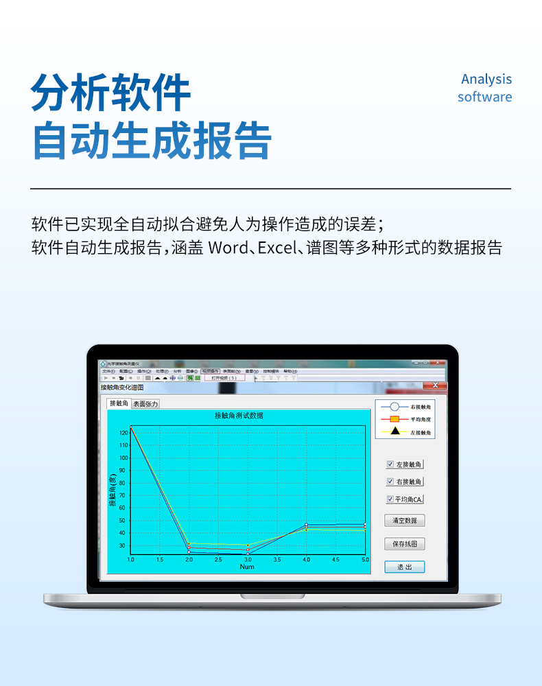 分析軟件功能強大 ,具備一鍵式全自動擬合能力 ,具備國際最領先的擬合方法 ,滿足各 種液滴形態的精確擬合;