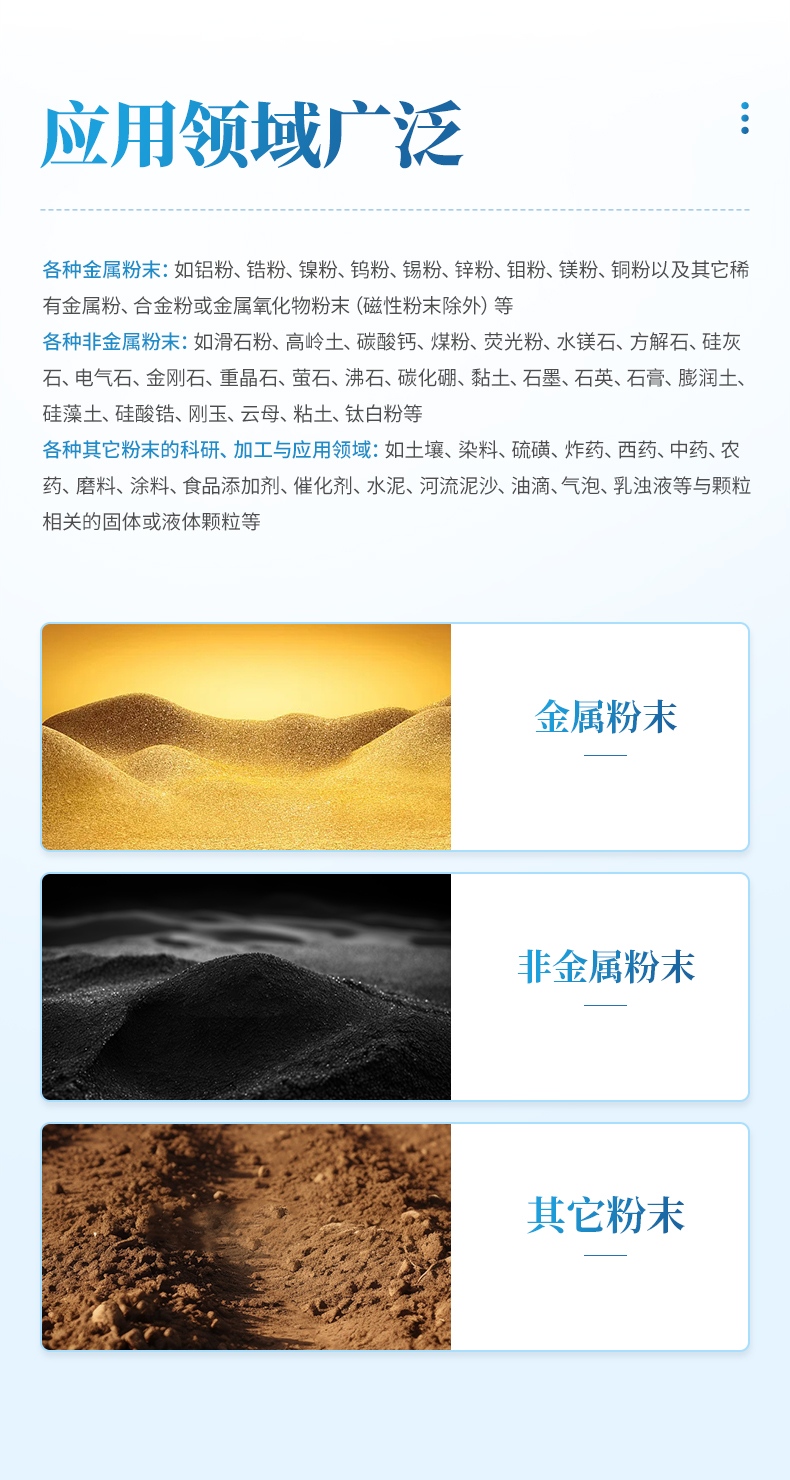 3. 各種其它粉末的科研、加工與應用領域:如土壤、染料、硫磺、炸藥、西藥、中藥、農藥、磨料、涂料、食品添加劑、催化劑、水泥、河流泥沙、油滴、氣泡、乳濁液等與顆粒相關的固體或液體顆粒等。