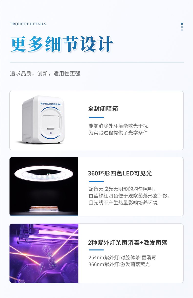 內(nèi)置366nm紫外燈,可激發(fā)菌落熒光,滿足大腸埃希氏菌計(jì)數(shù)、綠色熒光蛋白觀察等需求