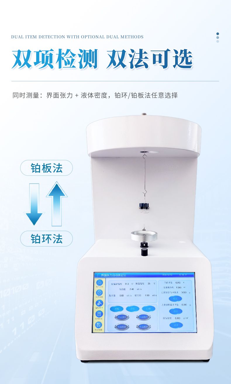 3. 可同時(shí)測表界面張力和密度:集成兩項(xiàng)測量功能,無需額外設(shè)備。
