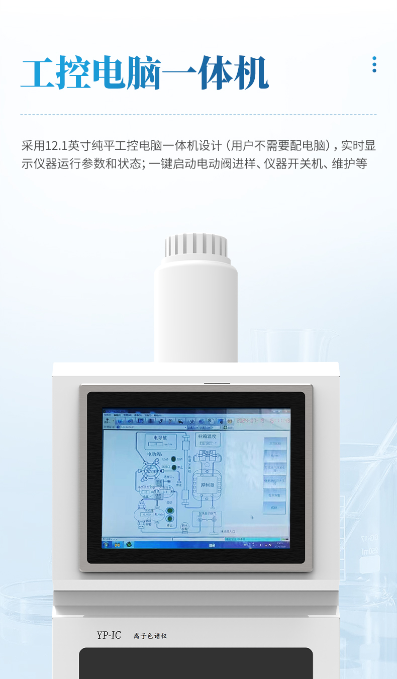全新一代YP-IC+離子色譜儀,采用12.1吋純平工控電腦一體機(jī)設(shè)計(jì)(用戶不需要配電腦),實(shí)時(shí)顯示儀器運(yùn)行參數(shù)和狀態(tài);一鍵啟動(dòng)電動(dòng)閥進(jìn)樣,一鍵完成儀器開(kāi)關(guān)機(jī)、維護(hù)等操作,一鍵調(diào)閱儀器操作教程,方便快捷。