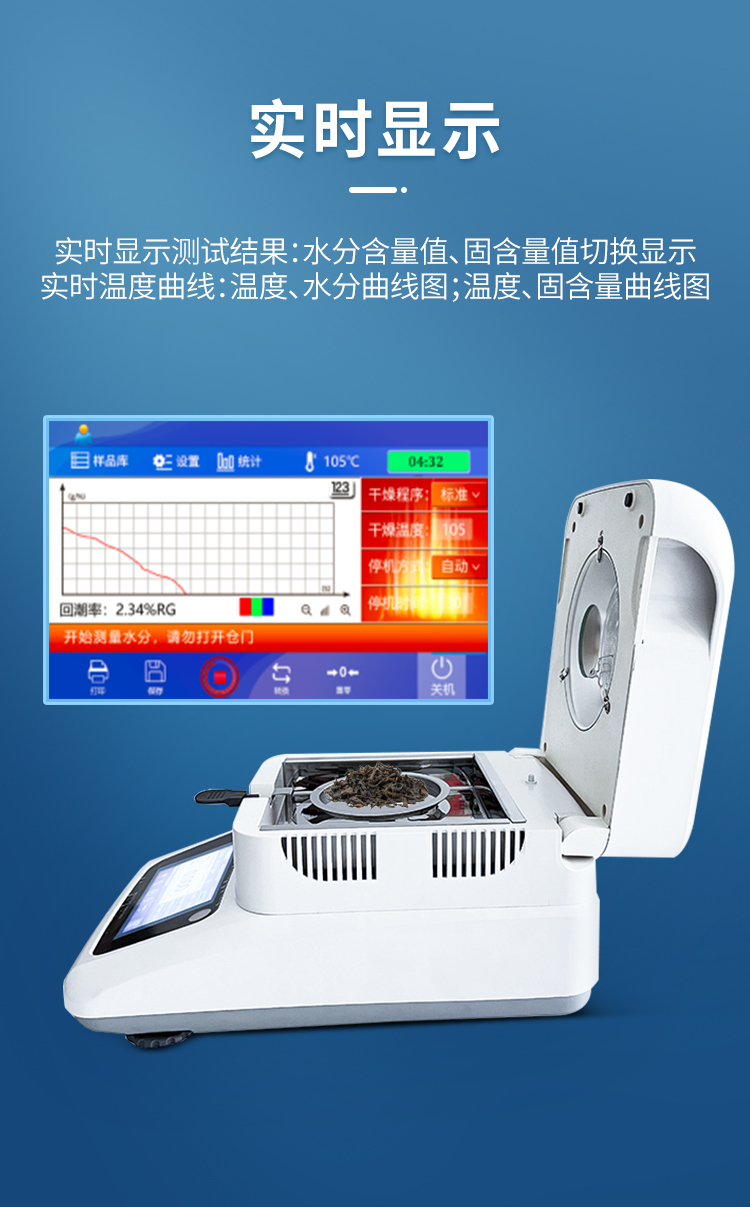 | 顯示結果 | 水分值、固含量、干燥前重量、干燥后重量、水分曲線圖 |