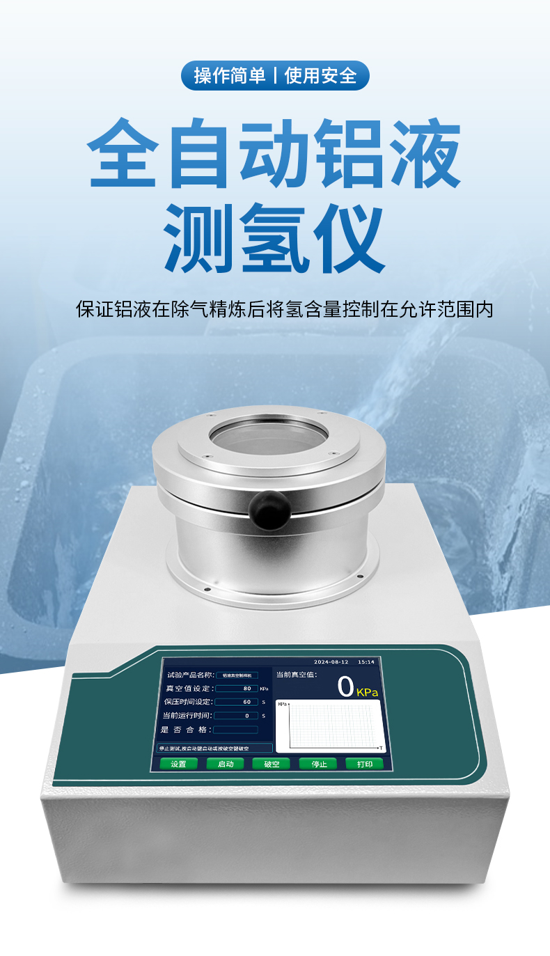由于鋁液是在真空中凝固,其整個凝固過程不受外界空氣的影響,測得試樣的含氫量就是坩堝取樣時的含氫量。設備具有檢測準確、運行可靠、易于操作、維護簡便等優點,是鋁制件廠檢測含氫量的理想設備。