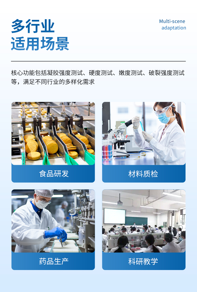 廣泛應用于食品、生物制品、藥品、化妝品及包裝材料等諸多領域:可進行魚糜強度測試、蛋殼強度測試、肉品嫩度測試、肉品系水性測試、凝膠強度測試、香精爆珠測試、水果硬度測試、植物莖桿強度測試。小麥硬度測試、飼料硬度測試、茶葉桿預嫩度測試、甜玉米硬度測試。土硬度測試。淀粉拉絲性測試、劑破裂強度測試,劑包衣阻隔特性測試、錦劑膜衣粘性測試、顆粒狀藥劑的易碎性測試。柱劑硬度測試、生物粘附劑測試等等(不同測試用不同夾具)