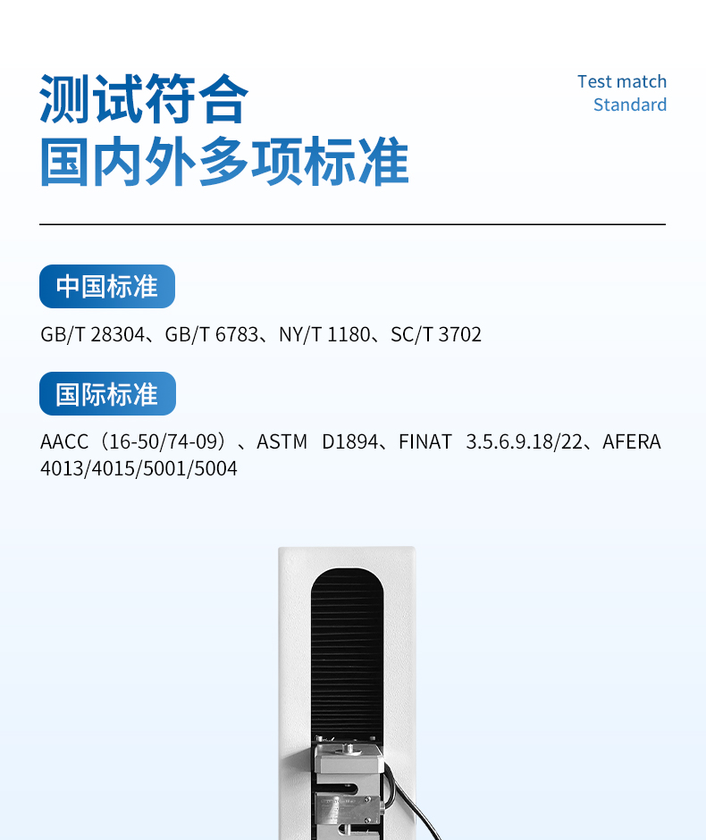 該儀器符合多項國家和國際標準:GB/T 28304-2012GB/T6783-2013、AACC(16-50)、 AACC(74-09) 、NYT 11802006SC/T 3702-2014 、 ASTM D1894-90 、FINATmethod 3.5.6.9.18 22、 AFERA40134015.5001.5004
