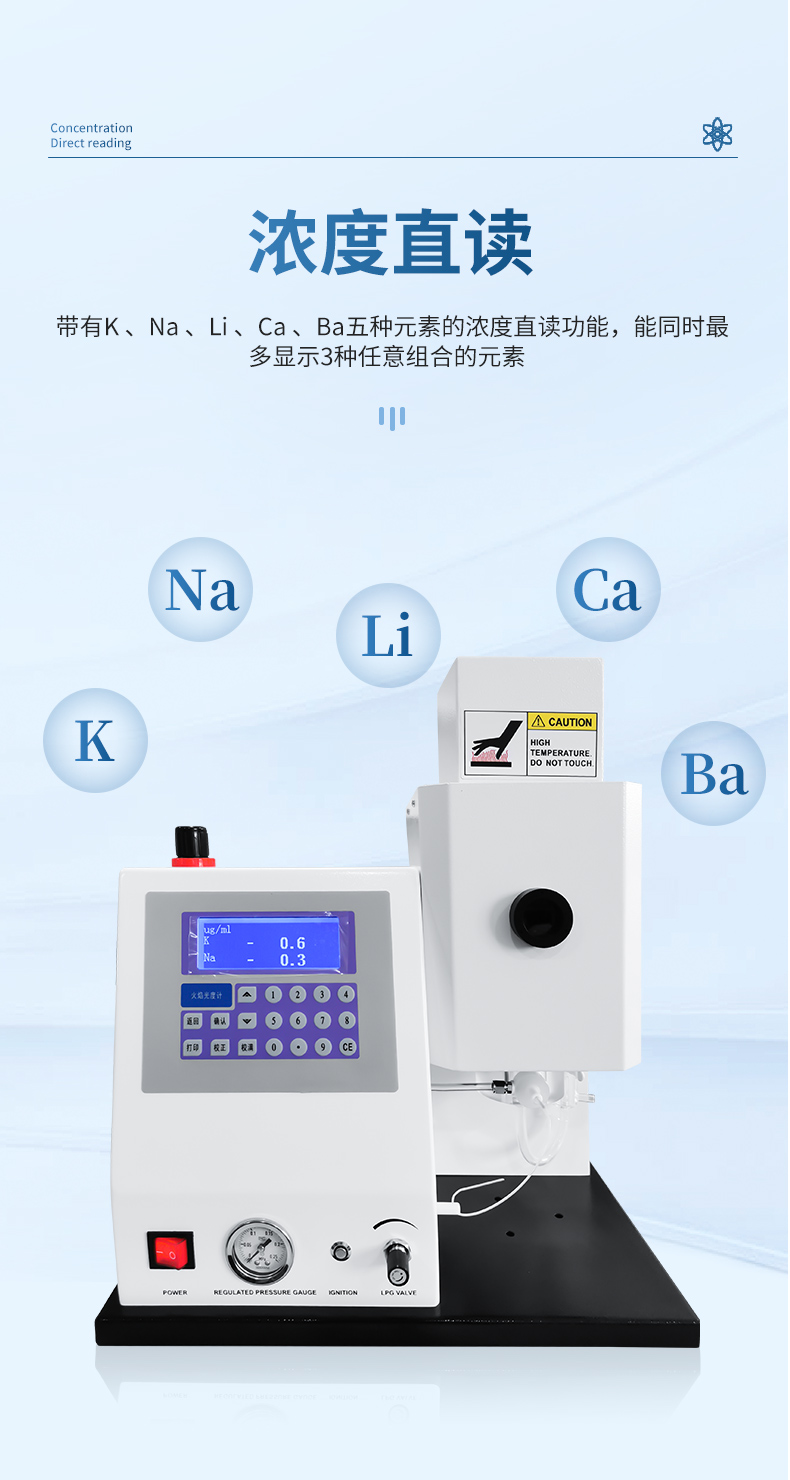 1) 帶有K 、Na 、Li 、Ca 、Ba五種元素的濃度直讀功能,能同時最多顯示3種任意組合的元素;