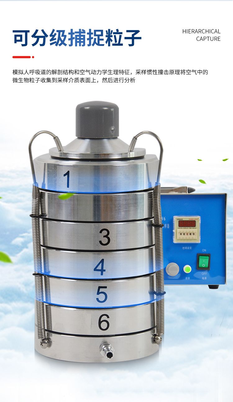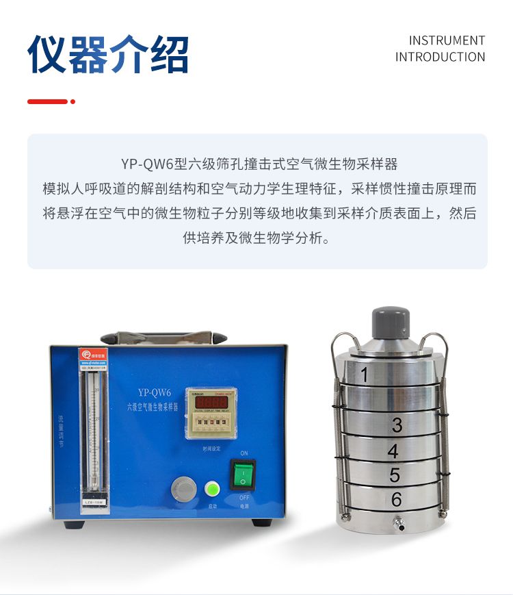 YP-QW6型六級篩孔撞擊式空氣微生物采樣器模擬人呼吸道的解剖結構和空氣動力學生理特征,采樣慣性撞擊原理而將懸浮在空氣中的微生物粒子分別等級地收集到采樣介質表面上,然后供培養及微生物學分析。