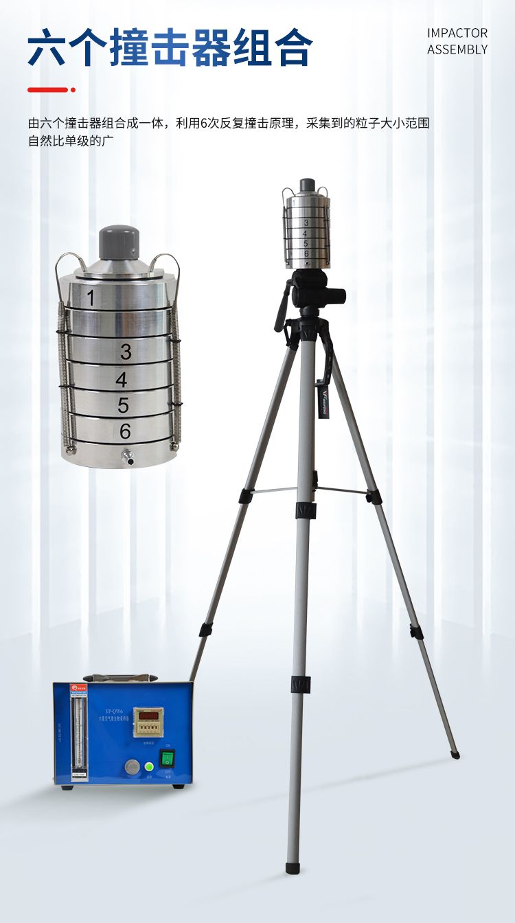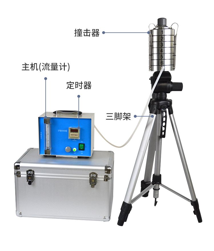 整個儀器是由撞擊器、主機(流量計)、定時器、三腳架組成。撞擊器是6層有微小孔眼的鋁合金圓盤。圓盤下放瓊脂平皿,每圓盤間有密封膠圈,在通過三個彈簧掛 鉤把圓盤牢固地聯在一起。每個圓盤上有400個成環行排列、逐層減小、尺寸精確的小孔,標準采樣流量為1立方呎(28.3L/min)。當含有微生物粒子 的氣流進入最上層的采樣口后,由于氣流的逐層增高,不同大小的微生物粒子按空氣動力學特征分別撞擊在相應的瓊脂表面上。捕獲在各級上的粒子大小范圍是由該 級孔眼的氣流速度和上一級的粒子截阻率而決定的。第1、2級類似人的上呼吸道捕獲的粒子,第3~6級類似人的下呼吸道捕獲的粒子,這就相當程度上復制了這 些粒子在呼吸道的穿透作用和沉著部位。