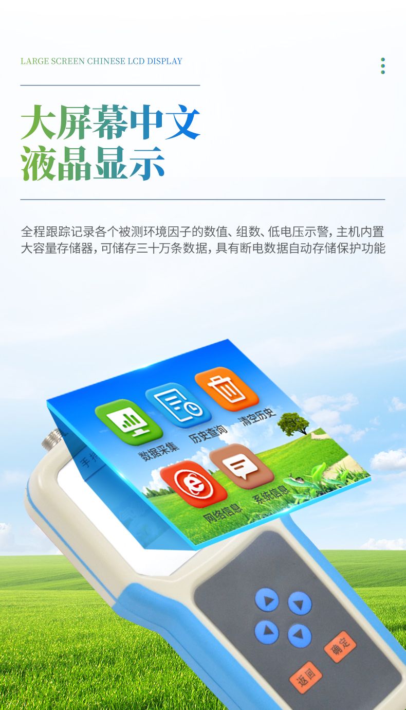 大屏幕中文液晶顯示,全程跟蹤記錄各個被測環境因子的數值、組數、低電壓示警,主機內置大容量存儲器,可儲存三十萬條數據,具有斷電數據自動存儲保護功能。
