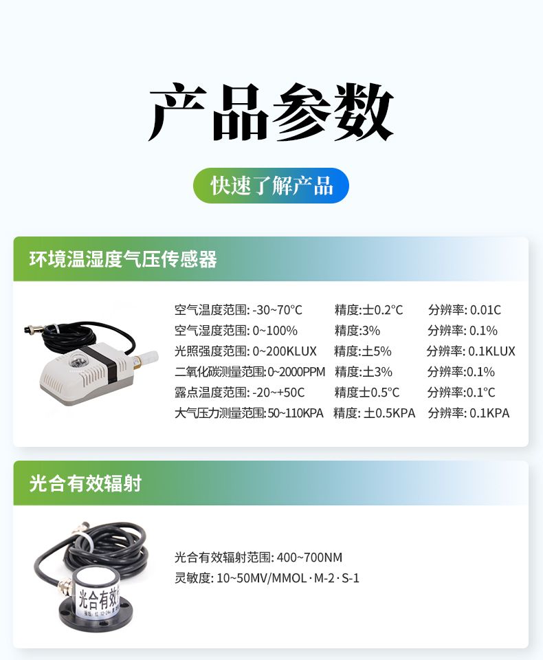 手持式智能農業氣象環境檢測儀是我們專門針對農田、草場局部小尺度環境設計的,對與植被和農作物生長密切相關的土壤、水氣等環境參數監測的農田小氣候站。它主要觀測與農業相關的空氣溫度、空氣濕度、光照強度、二氧化碳濃度、露點溫度、光合有效輻射等5個環境參數氣象要素,為農業科研、農業生產等提供良好的支持。