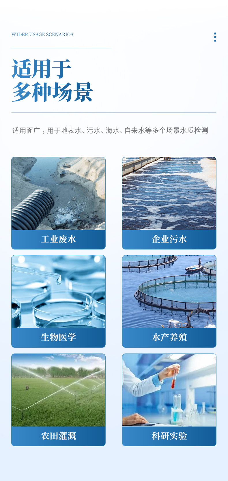 適用面廣,可用于地表水、污水、海水、自來水等多個場景水質檢測,滿足客戶需求。