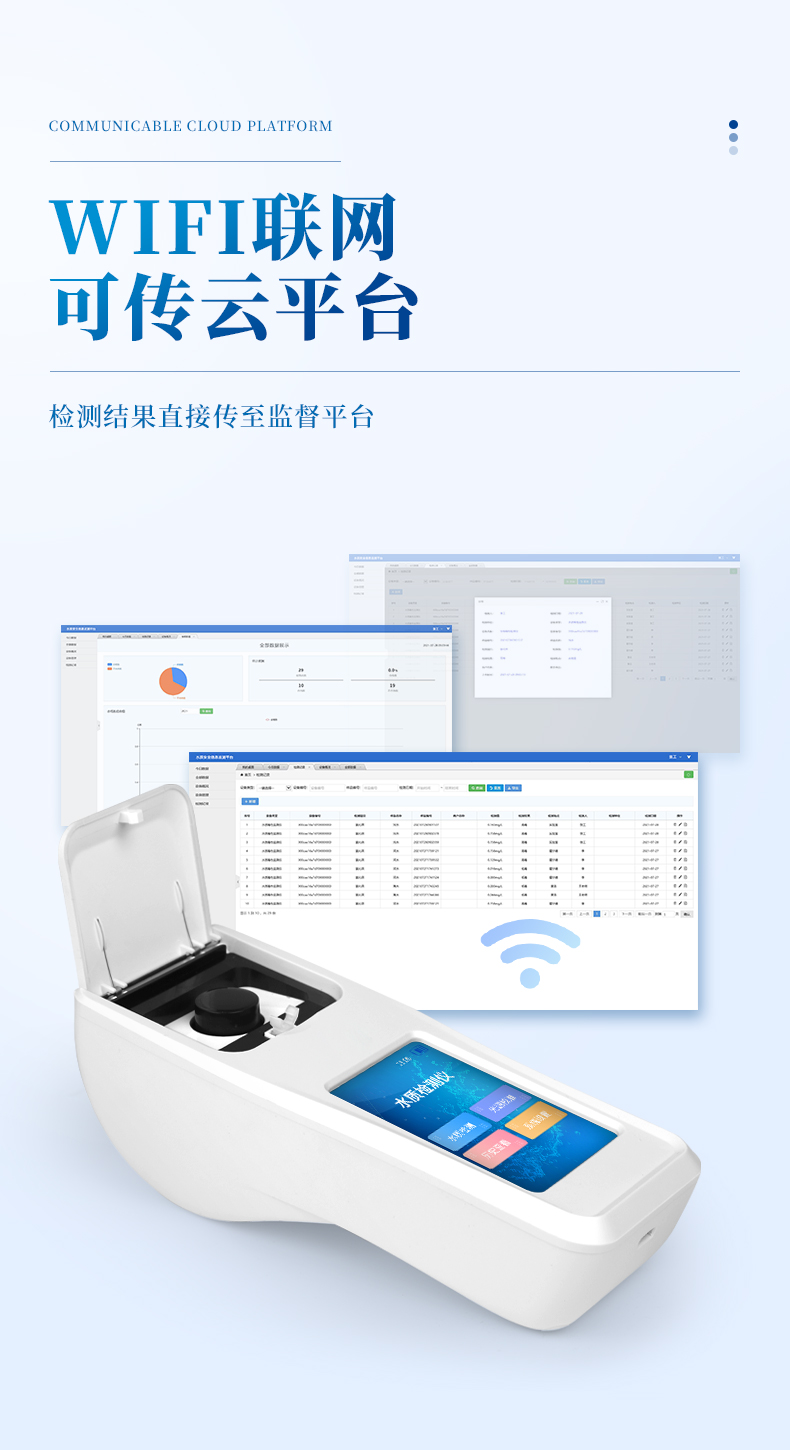 ②配置云監(jiān)控平臺,檢測結(jié)果可直接無線傳至平臺,進行水質(zhì)長短期分析,輔助管理。