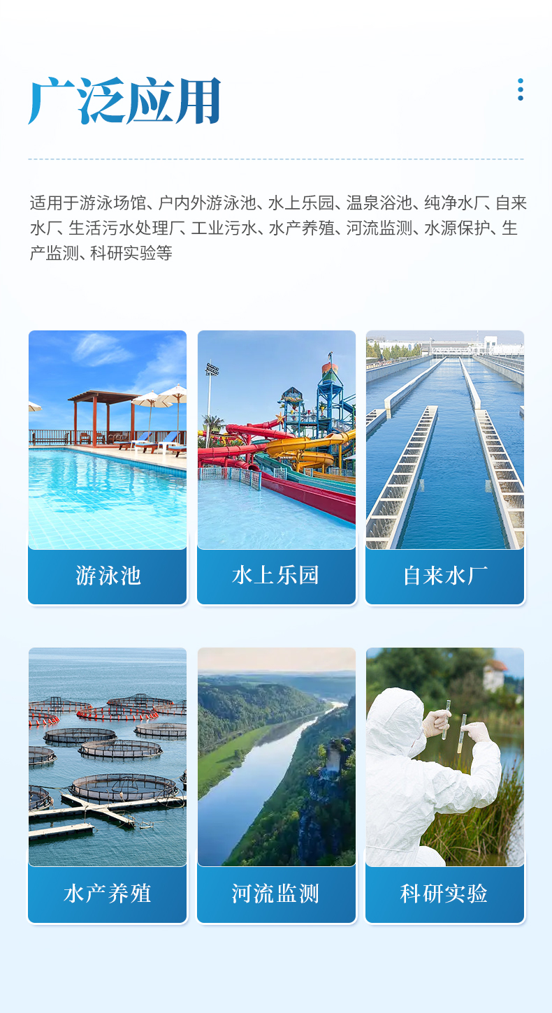 適用于游泳場(chǎng)館、戶內(nèi)外游泳池、水上樂(lè)園、溫泉浴池、純凈水廠、自來(lái)水廠、生活污水處理廠、工業(yè)污水、水產(chǎn)養(yǎng)殖、河流監(jiān)測(cè)、水源保護(hù)、生產(chǎn)監(jiān)測(cè)、科研實(shí)驗(yàn)等。