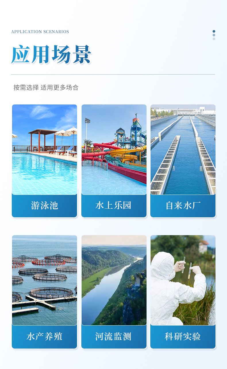 適用于游泳場館、戶內外游泳池、水上樂園、溫泉浴池、純凈水廠、自來水廠、生活污水處理廠、工業(yè)污水、水產養(yǎng)殖、河流監(jiān)測、水源保護、生產監(jiān)測、科研實驗等。