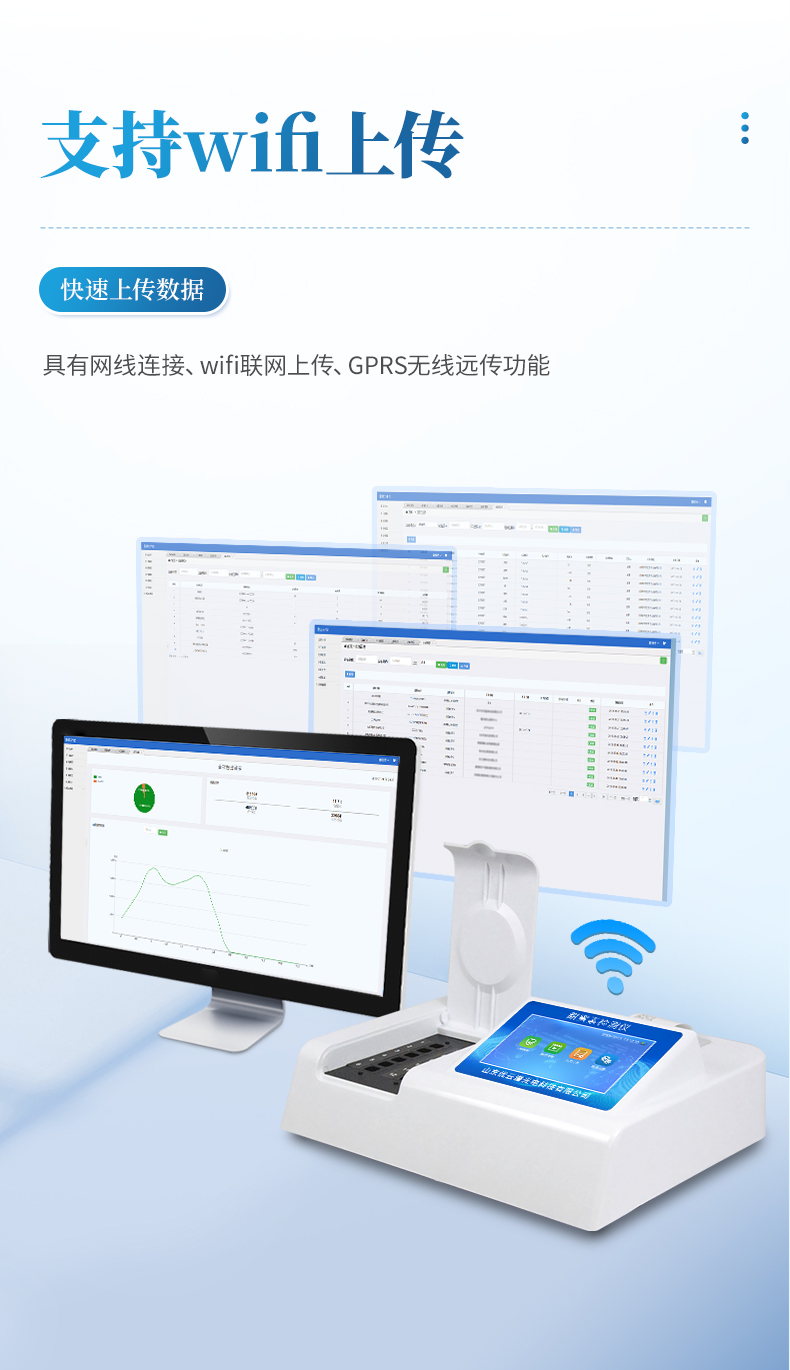 2、儀器具有網(wǎng)線連接、wifi聯(lián)網(wǎng)上傳、GPRS無線遠傳功能,快速上傳數(shù)據(jù)。