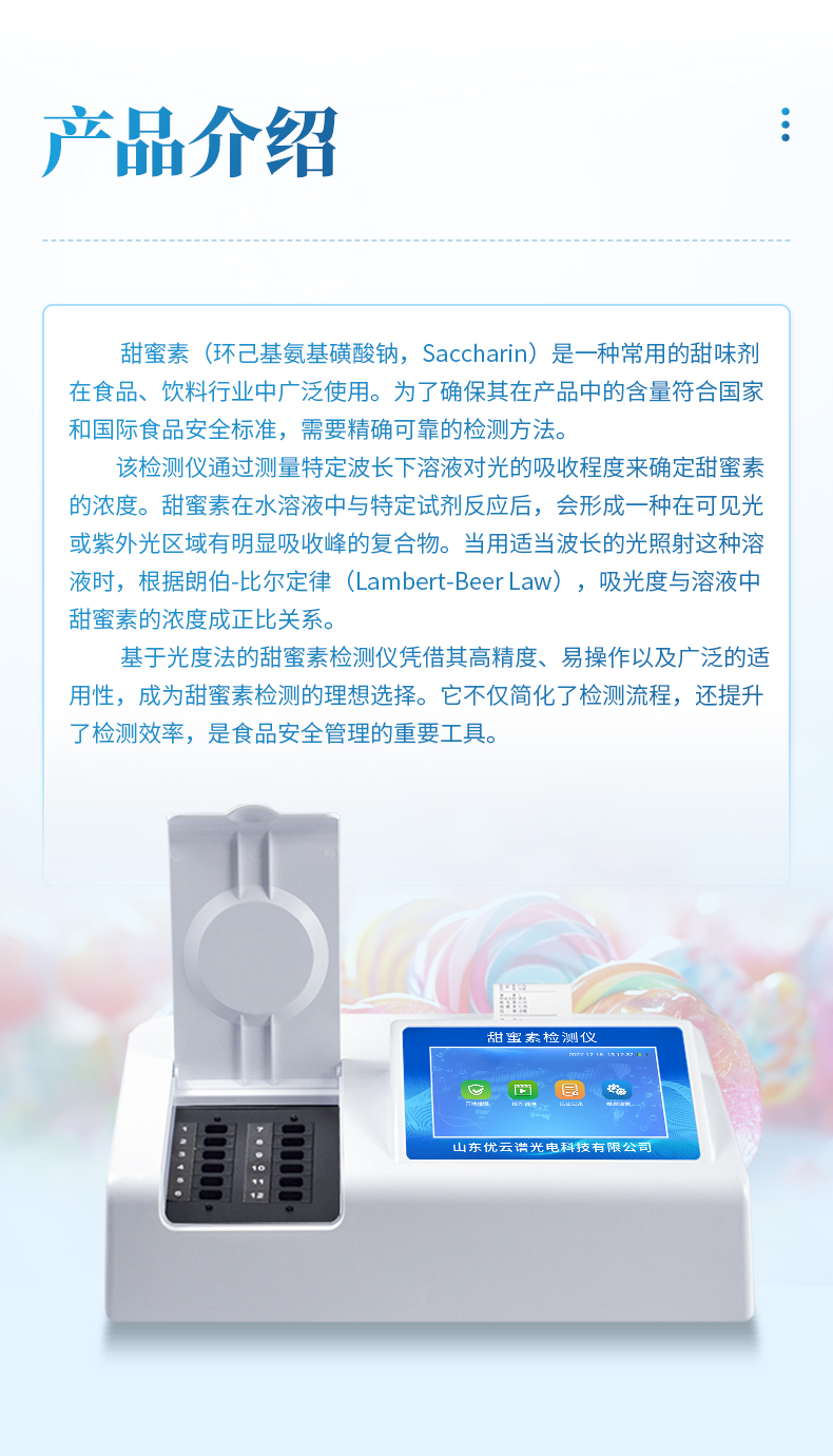 基于光度法的甜蜜素檢測儀憑借其高精度、易操作以及廣泛的適用性,成為甜蜜素檢測的理想選擇。它不僅簡化了檢測流程,還提升了檢測效率,是食品安全管理的重要工具。