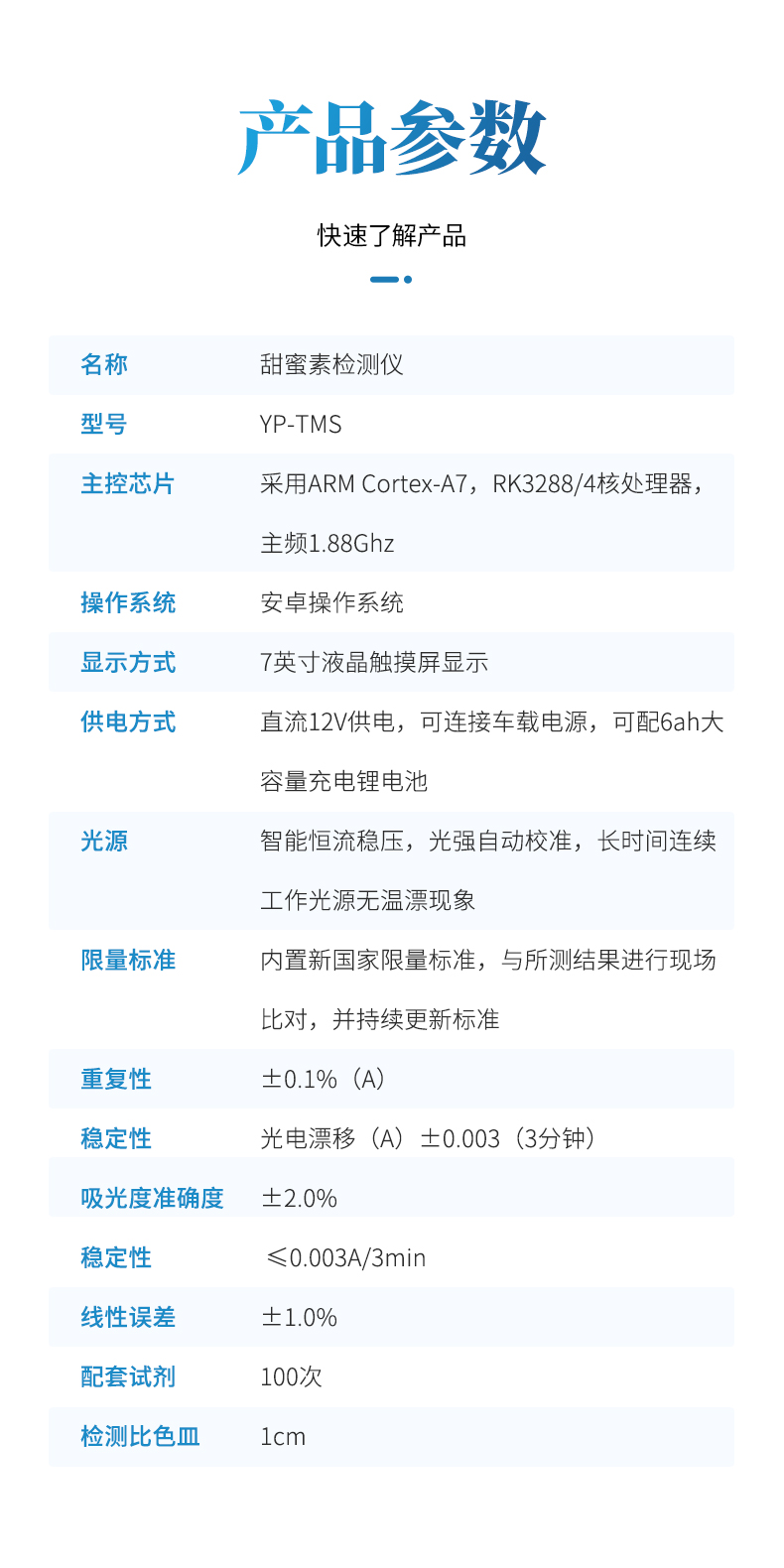 該檢測儀通過測量特定波長下溶液對光的吸收程度來確定甜蜜素的濃度。甜蜜素在水溶液中與特定試劑反應后,會形成一種在可見光或紫外光區(qū)域有明顯吸收峰的復合物。當用適當波長的光照射這種溶液時,根據(jù)朗伯-比爾定律(Lambert-Beer Law),吸光度與溶液中甜蜜素的濃度成正比關系。