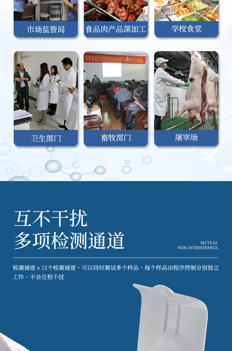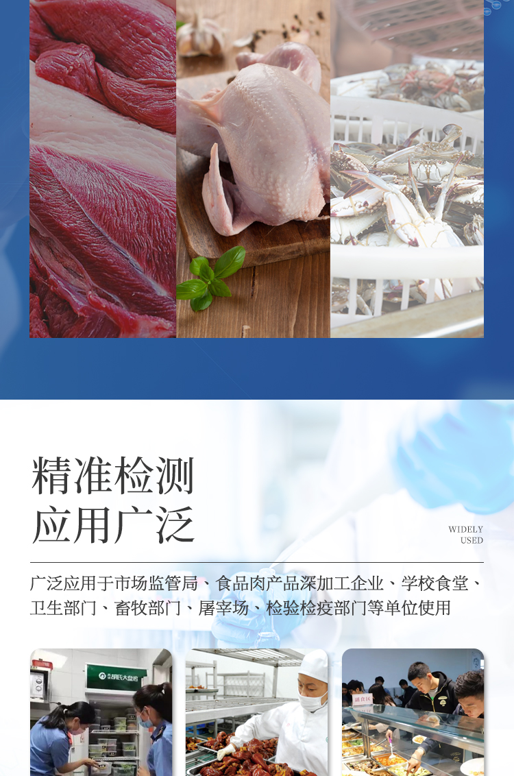 該多功能食品安全檢測儀為集成一體化食品安全快速檢測分析設備,廣泛應用于市場監管局、食品肉產品深加工企業、學校食堂、衛生部門、畜牧部門、屠宰場、檢驗檢疫部門等單位使用。
