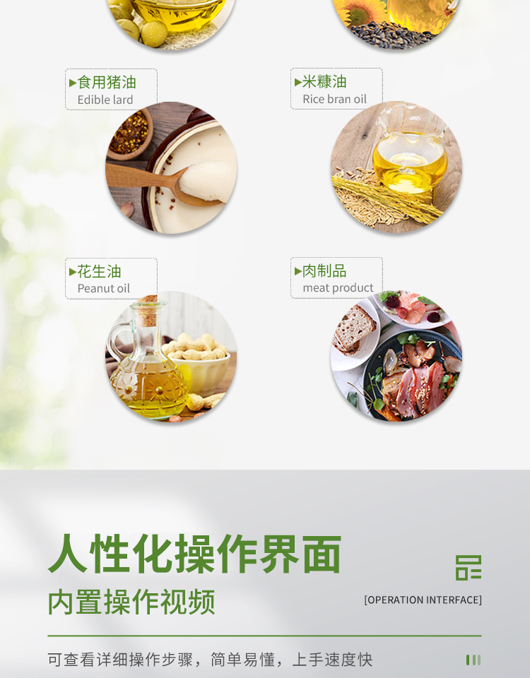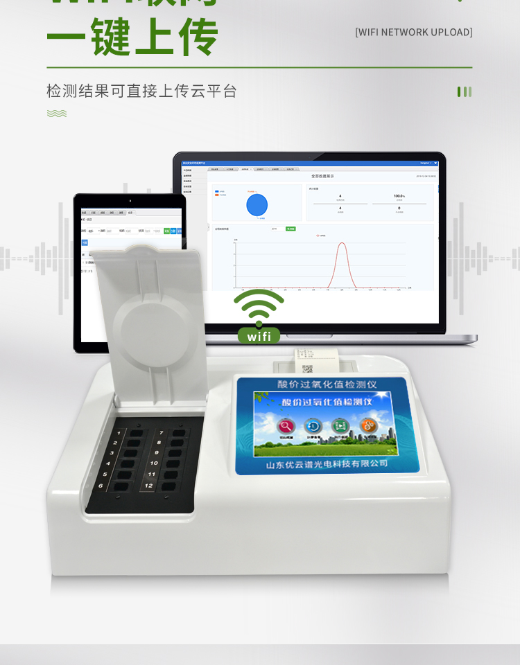 食用油過氧化值檢測儀為集成化油品快速檢測分析設備,能夠快速檢測食用植物油、食用豬油、花生油、葵花油、米糠油、食品、肉制品中的過氧化值含量;通過檢測可確定植物油是否符合國家標準或是否為劣質油、地溝油等。儀器預留其他項目檢測程序和端口,根據日后需求可方便的自主增加檢測項目。日后可升級為檢測水產品、面制品的綜合類型儀器。