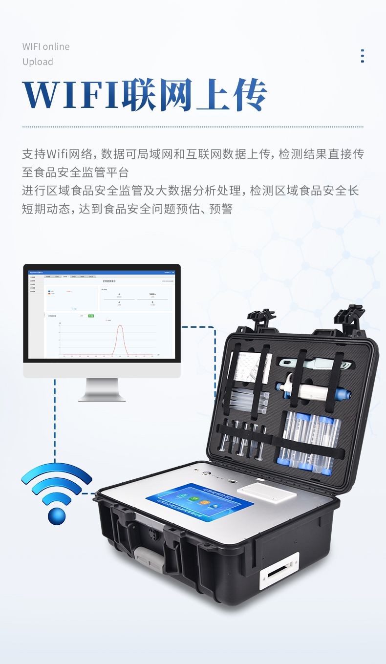 13、支持Wifi網(wǎng)絡(luò),數(shù)據(jù)可局域網(wǎng)和互聯(lián)網(wǎng)數(shù)據(jù)上傳,檢測結(jié)果直接傳至食品安全監(jiān)管平臺。進行區(qū)域食品安全監(jiān)管及大數(shù)據(jù)分析處理,檢測區(qū)域食品安全長短期動態(tài),達(dá)到食品安全問題預(yù)估、預(yù)警