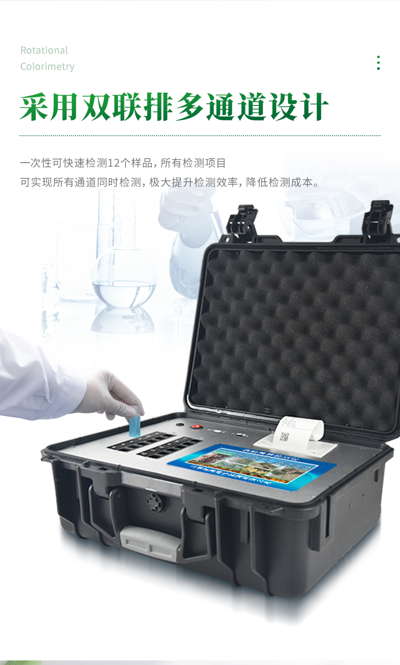 11、高強(qiáng)度PVC工程塑料手提箱設(shè)計(jì),堅(jiān)固耐用,便于攜帶,供電方式為交直流兩用,可野外流動(dòng)測(cè)試配套成品藥劑。