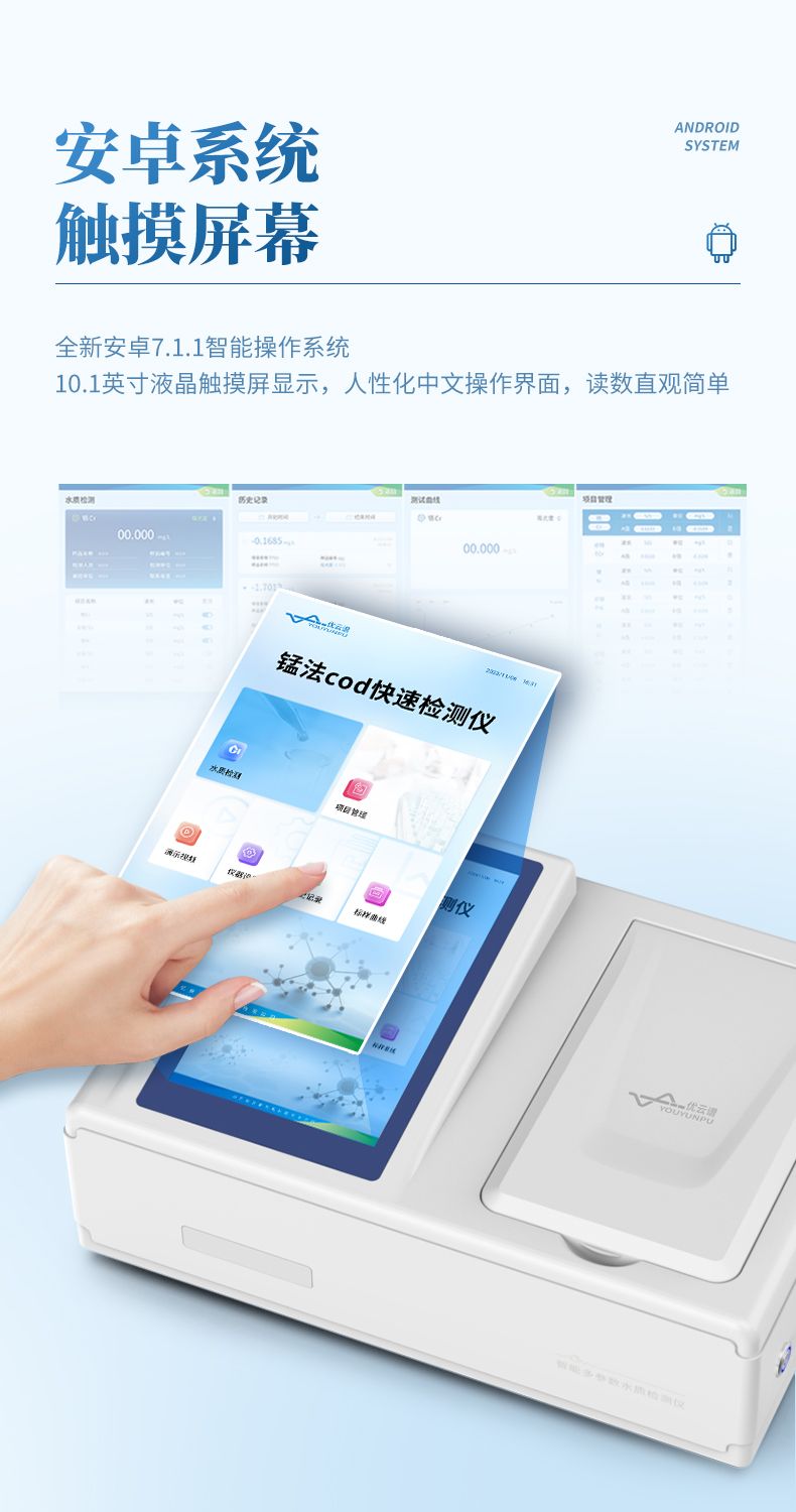 本儀器采用錳法測(cè)定水中的COD指標(biāo),又稱(chēng)CODMn或高錳酸鹽指數(shù),兼具智能數(shù)據(jù)分析功能,圖表、列表顯示數(shù)據(jù),分析一目了然;高清晰度彩色液晶觸摸顯示屏,Android智能操作系統(tǒng),中文顯示界面,中英文鍵盤(pán),人性化操作,使用更簡(jiǎn)單。