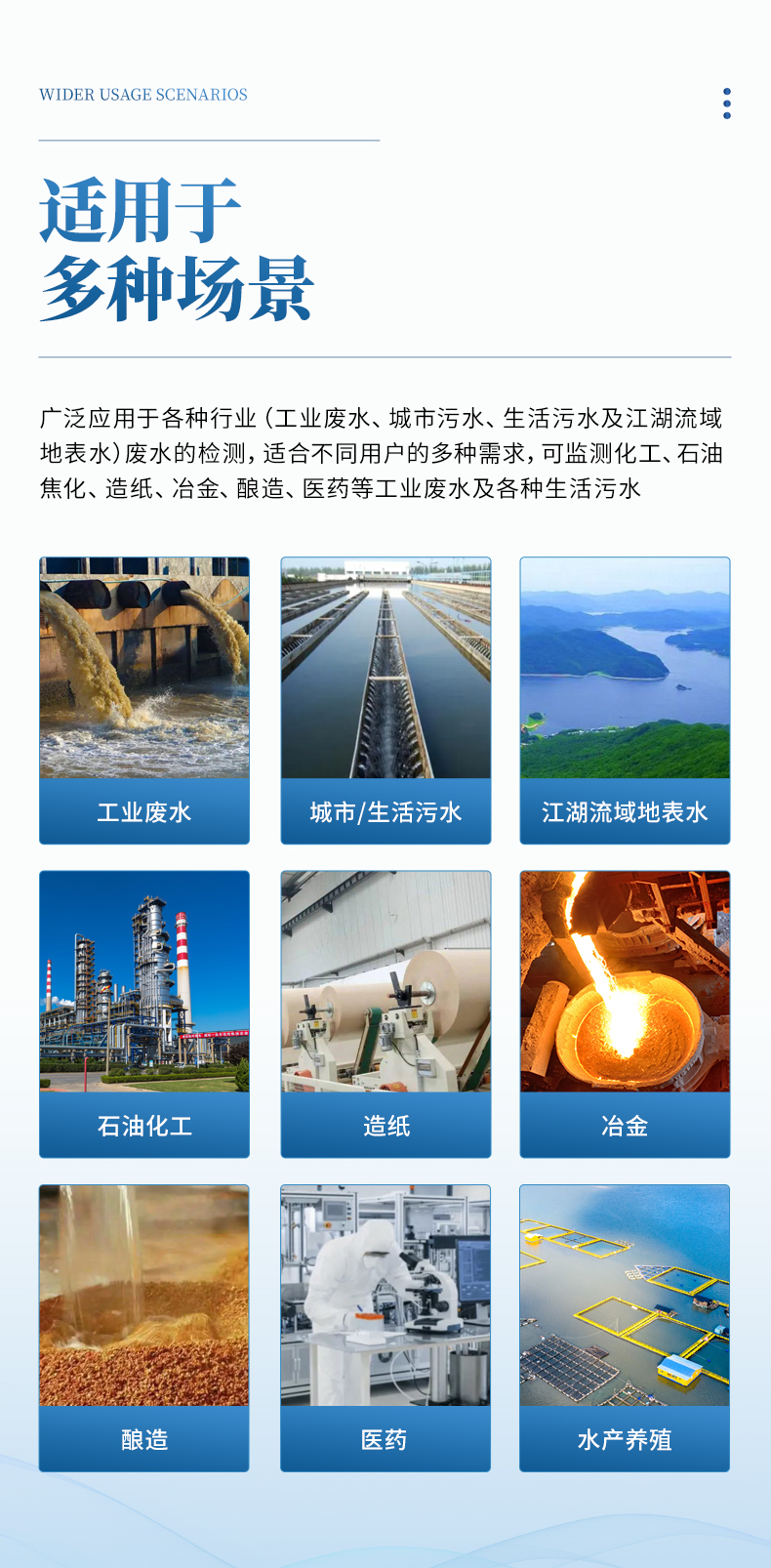 能夠廣泛的應用于各種行業(工業廢水、城市污水、生活污水及江湖流域地表水)廢水的檢測,可適合不同用戶的多種需求,可在化工、石油、焦化、造紙、冶金、釀造、醫藥等工業廢水及各種生活污水監測應用。