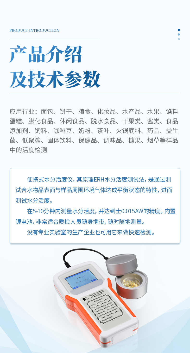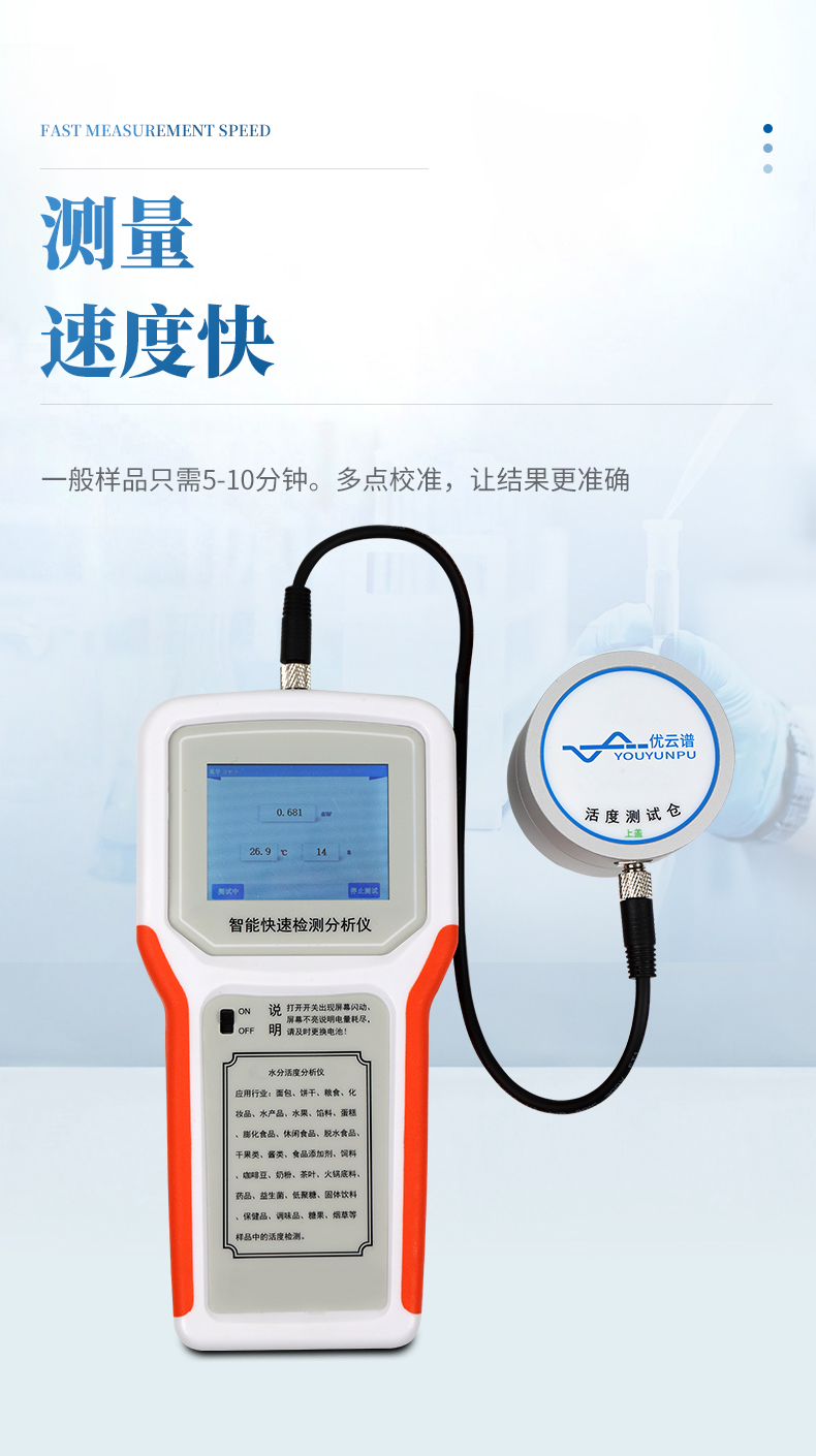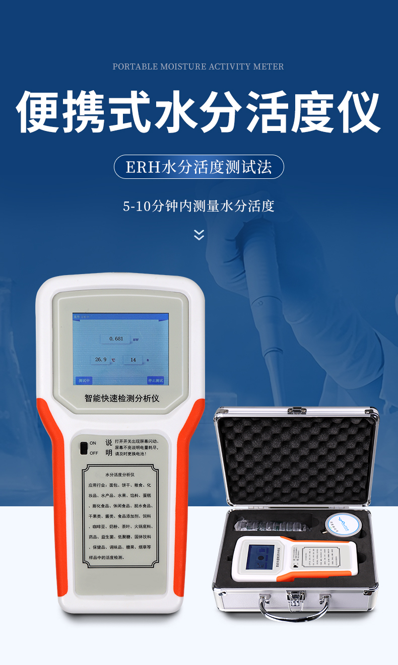 便攜式水分活度儀,其原理ERH水分活度測試法,是通過測試含水物品表面與樣品周圍環境氣體達成平衡狀態的特性,進而測試水分活度。在5-10分鐘內測量水分活度,并達到士0.015aw的精度。內置鋰電池,非常適合質檢人員隨身攜帶,隨時隨地測量。沒有專業實驗室的生產企業也可用它來做快速檢測。
