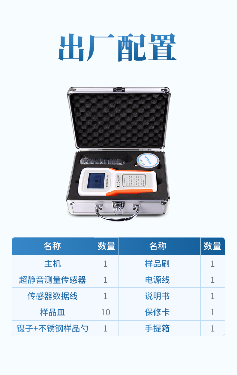 主機一臺、超靜音測量傳感器一個、傳感器數據線一條、樣品皿:10個、鑷子一把、不銹鋼樣品勺:一把、樣品刷一把、電源線一根、說明書一份、保修卡 一份、包裝箱一個。