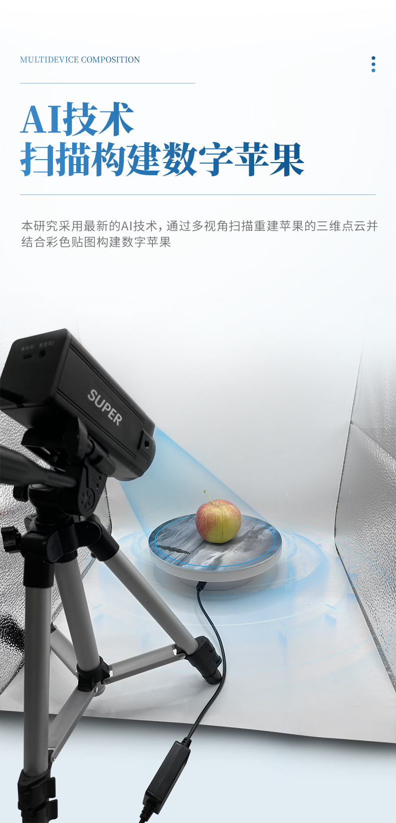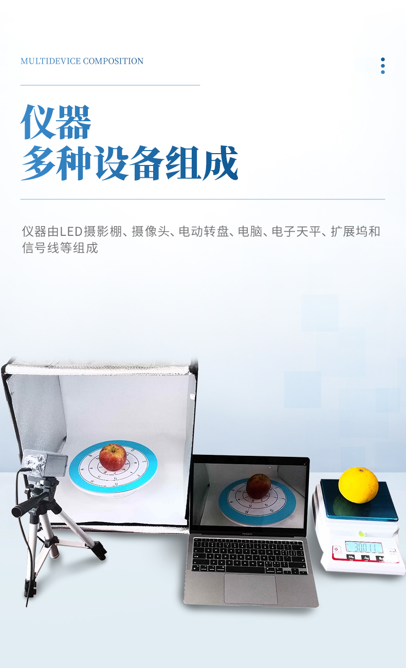 儀器由LED攝影棚、攝像頭、電動轉盤、電腦、電子天平、擴展塢和信號線等組成,可獲取蘋果的三維表型信息,測量水果體積、面積、重量、密度、顏色及紋理等信息。
