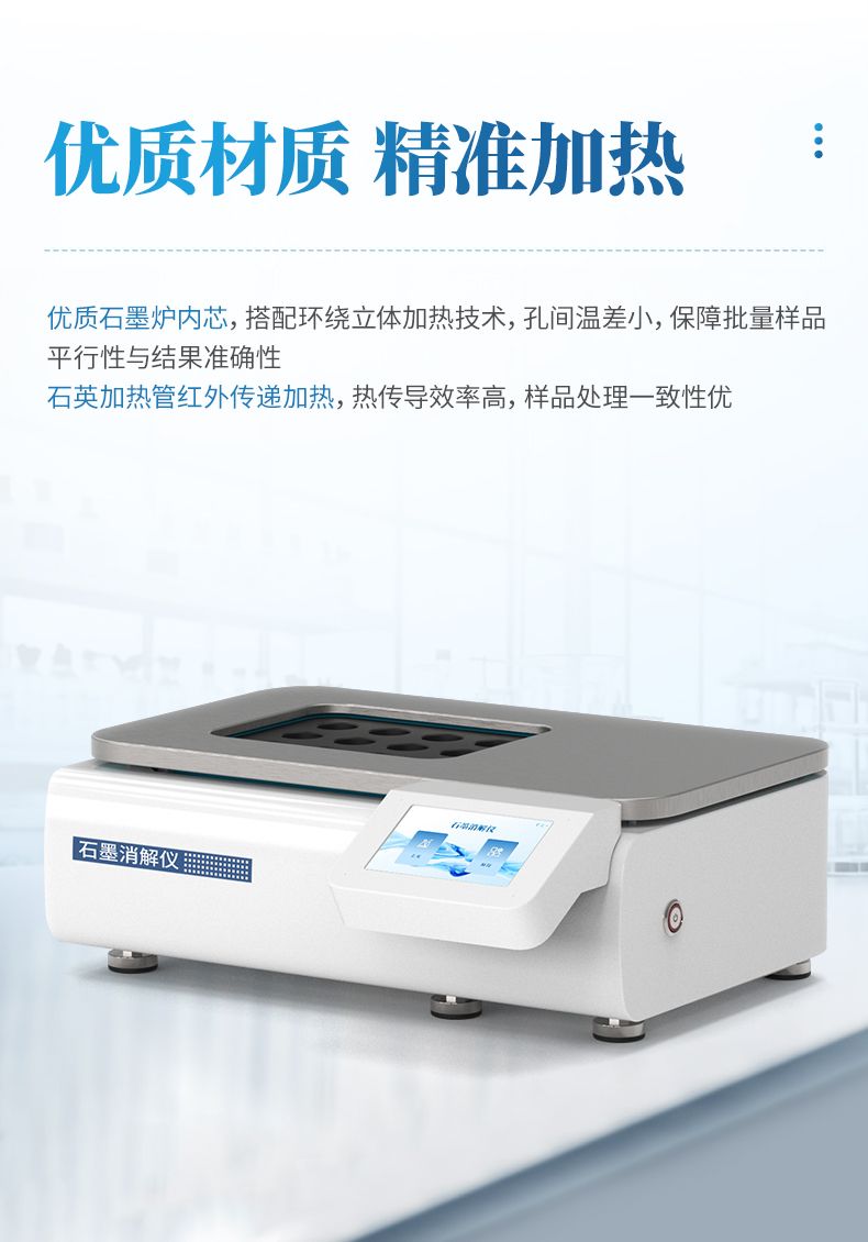 石墨消解儀采用優(yōu)質(zhì)高純石墨材質(zhì),結(jié)合精確的環(huán)繞立體加熱技術(shù),確保消解孔間溫差極小,有效保障了批量樣品處理的平行性與結(jié)果準(zhǔn)確性。智能PID溫控系統(tǒng)支持高精度程序升溫,用戶(hù)可靈活設(shè)定并存儲(chǔ)多組消解程序,操作簡(jiǎn)便,重現(xiàn)性極佳。同時(shí),儀器具備超溫保護(hù)、漏電保護(hù)等多重安全機(jī)制,配合耐腐蝕設(shè)計(jì)及友好的操作界面,在提升實(shí)驗(yàn)效率的同時(shí),全力守護(hù)實(shí)驗(yàn)安全。