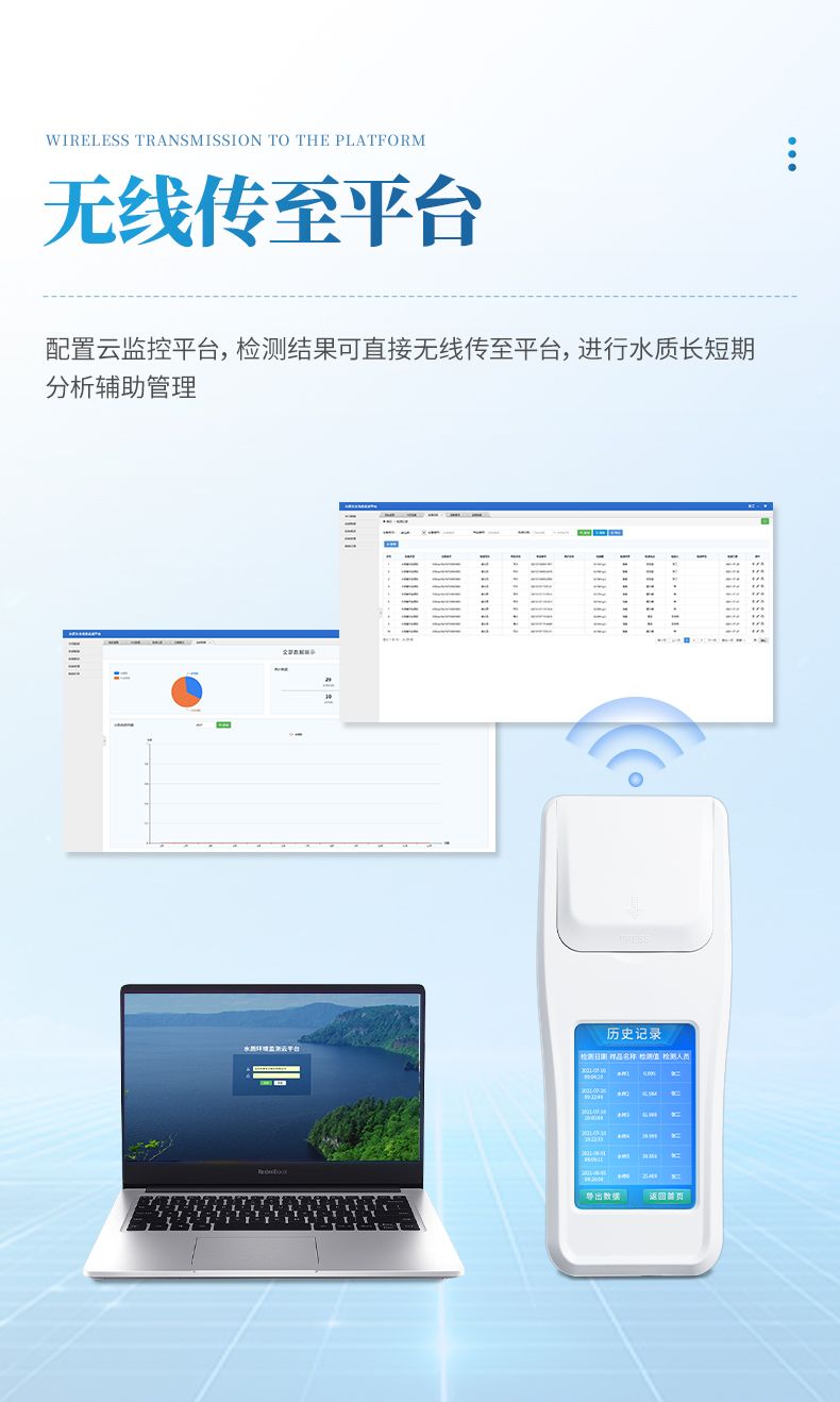 ②配置云監(jiān)控平臺,檢測結(jié)果可直接無線傳至平臺,進(jìn)行水質(zhì)長短期分析,輔助管理。